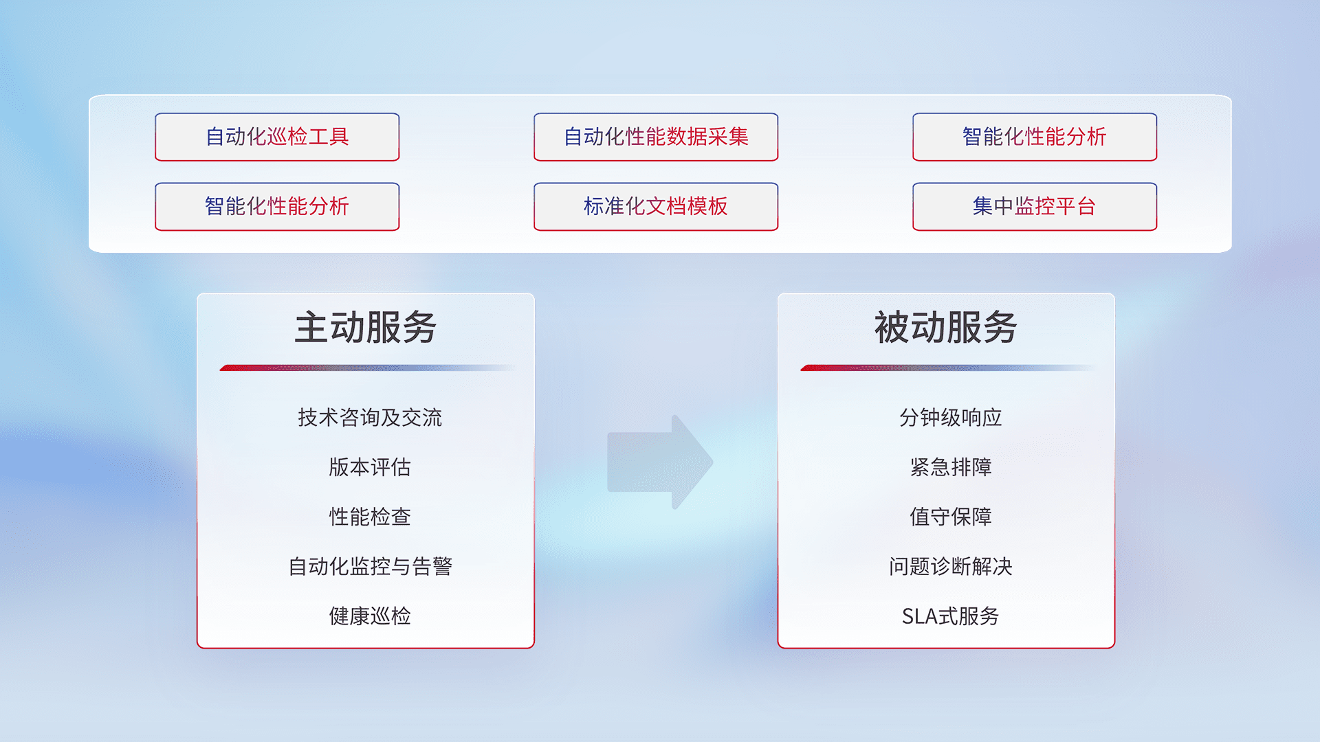 智能化工具和标准化文档,,,保障服务质量,,,,提供主动服务(包含技术咨询、、、版本评估、、性能检查、、、自动化监控与告警、、健康巡检)和被动服务包含(分钟级响应、、紧急排障、、值守保障、、问题诊断解决、、、SLA服务)。。。